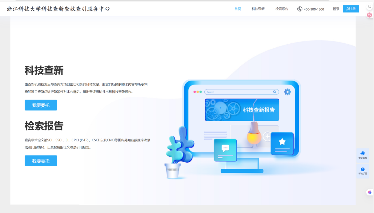 图例1  委托人点击链接https://zust.kjchaxin.com/,首次使用需要注册账号,点击右上角注册